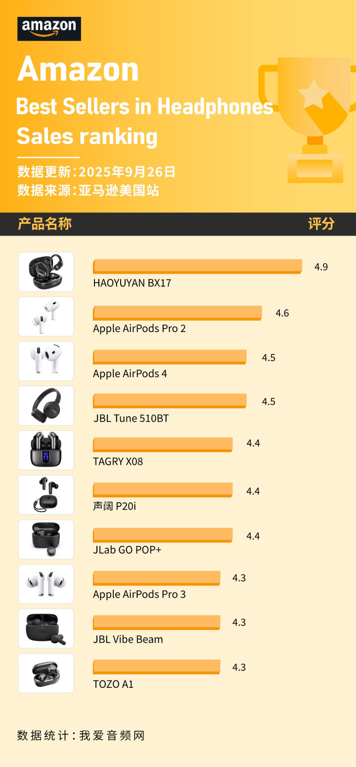 美国亚马逊2025年9月蓝牙耳机评分榜