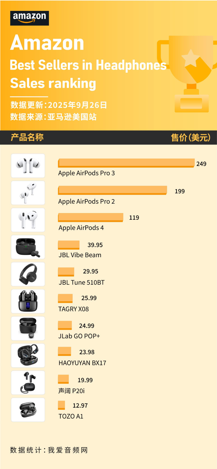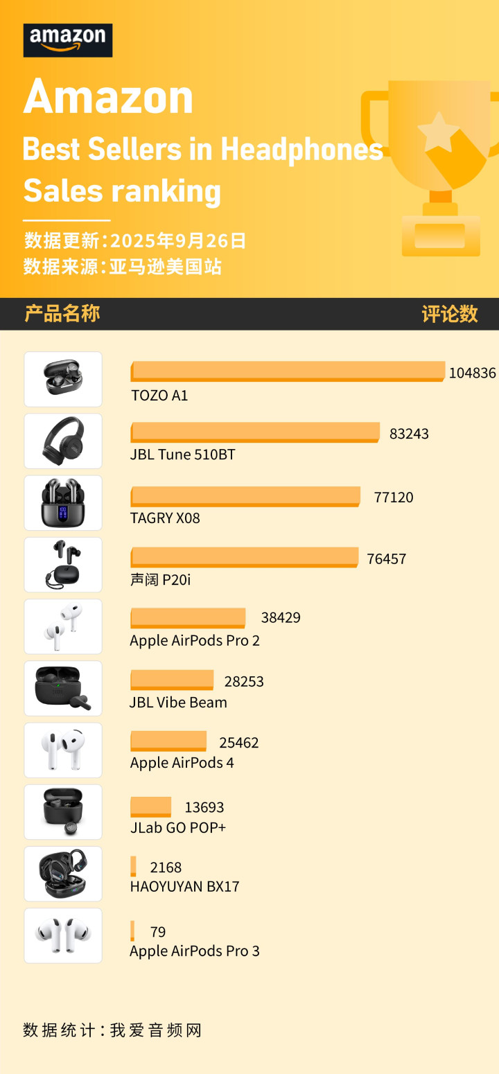 我爱音频网将从产品售价、产品口碑、产品互动量三个角度入手,去分析上榜耳机的产品特性与优势,以便更好的了解市场动态。以下数据截止至2025年9月26日,美国亚马逊耳机分类的销售排行榜前十的耳机(仅统计蓝牙耳机)。产品价格、评分、互动量均以统计时的数据为准。