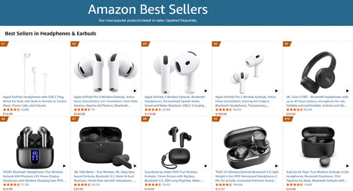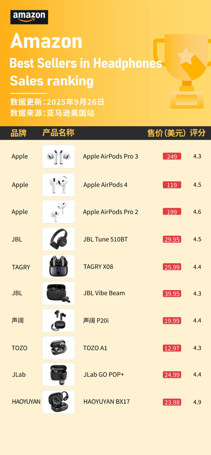 价格方面,榜单中的10款产品相差较大,从12.97美元到249美元。最贵的产品几乎是最便宜产品的20倍。其中榜单前三均为苹果的AirPods系列产品。最贵的是这个月刚发布的AirPods Pro 3,以249美元的售价位居榜首。另外,AirPods Pro 2和AirPods 4分别位于榜二、榜三,价格分别为199美元和119美元,两款产品比上个月还涨价了。