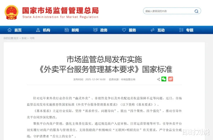 近日,为破解外卖行业长期存在的 “幽灵外卖”、非理性竞争、配送员权益保障不足等痛点,市场监管总局发布并实施推荐性国家标准《外卖平台服务管理基本要求》,该标准立足行业实际、坚持问题导向,明确 “四个聚焦、四个强化” 的整改方向,即聚焦商户管理强化主体责任,规范入驻审核并推动 “互联网 + 明厨亮灶” 守护食品安全;聚焦收费促销强化竞争秩序,要求平台简化收费项目、实现收费信息透明化;聚焦用工管理强化配送员权益保障,从劳动时间、职业培训、社会保障等方面健全保障机制;聚焦争议处理强化协商机制,搭建多元主体投诉处置渠道并主动接受社会监督。据悉,该标准遵循科学、规范、实用、前瞻原则,是对现有法规的细化补充,且吸纳了多方主体意见,将助力外卖平台优化管理、实现多方共赢,推动行业良性创新发展。对此,美团、京东外卖、淘宝闪购分别发布声明,宣布自愿执行《外卖平台服务管理基本要求》国家标准,将标准融入平台运营。